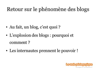 Le document présente une séance pilote sur les blogs, expliquant leur essor et le pouvoir croissant des internautes. Il aborde les aspects pratiques de la création et de la gestion d'un blog, ainsi que des éléments avancés tels que l'insertion de médias et le suivi des statistiques. Le document évoque également des thèmes d'écriture collaboratives et pédagogiques liés aux blogs et aux podcasts.
