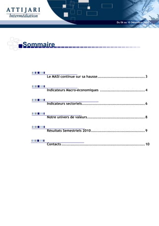 Du 6 au 10 décembre 2010, le MASI a continué d'afficher une tendance haussière, atteignant 12 813,85 points avec une performance annuelle de +22,69%. Les secteurs bancaire et télécoms ont connu des hausses significatives, tandis que le secteur des NTI a enregistré une baisse de 1,23%. En parallèle, des indicateurs macro-économiques montrent une amélioration des recettes liées au tourisme et des activités commerciales, malgré un déficit commercial persistant.