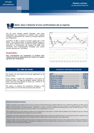 La semaine du 16 au 20 janvier 2012 a vu l'indice MASI augmenter de 1,53%, témoignant d'une reprise du marché boursier marocain, malgré un volume moyen quotidien d'échanges relativement faible de 56,51 MDH. Les secteurs du ciment et minier ont enregistré les plus fortes hausses, tandis que plusieurs entreprises ont émis des avertissements de bénéfices, suscitant des inquiétudes quant à la performance future. Les recommandations aux investisseurs soulignent la nécessité de la prudence, en attendant des signaux de retournement significatif de tendance.