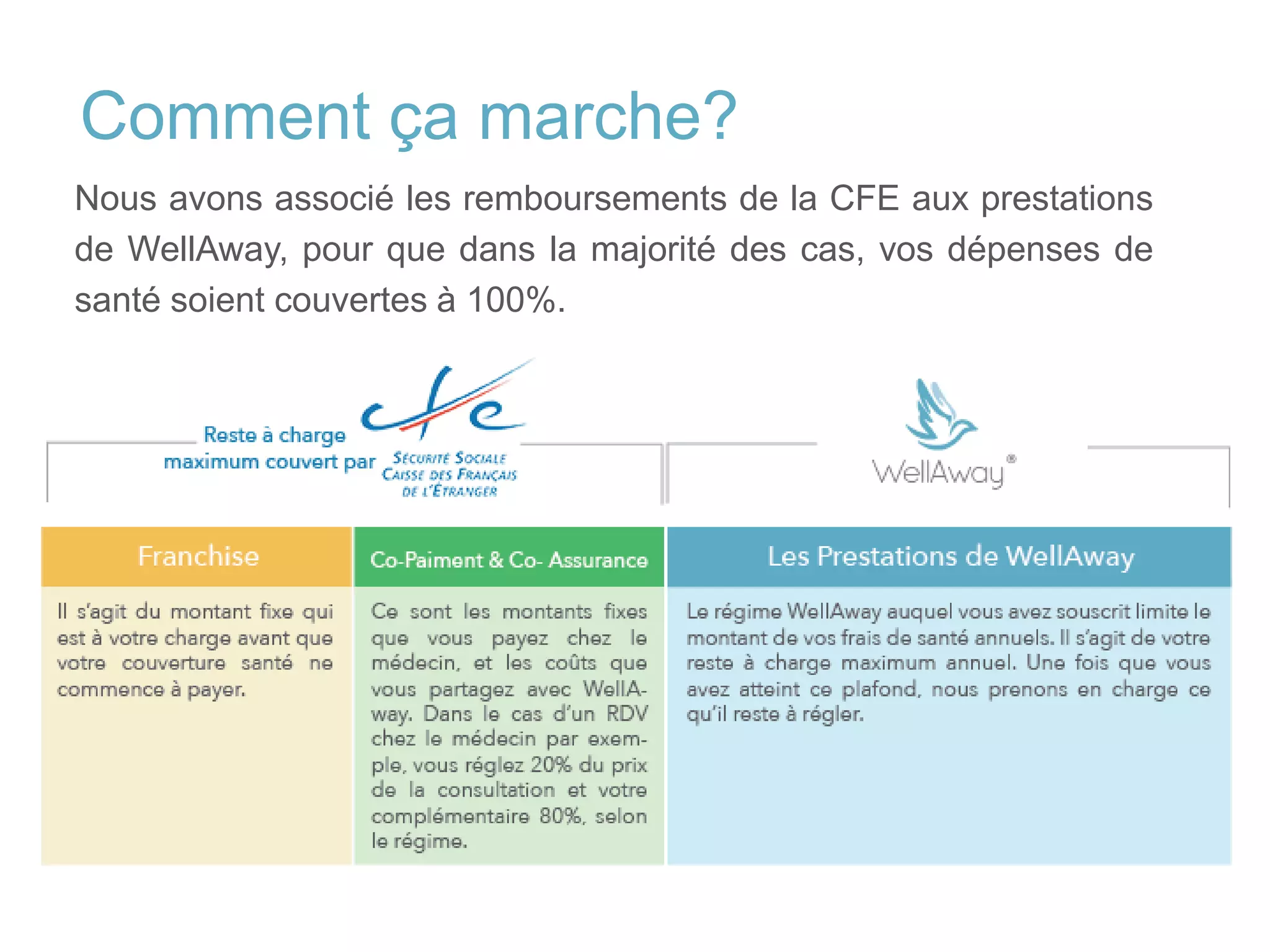 Le document explique le fonctionnement des remboursements de la CFE en association avec les prestations de Wellaway, garantissant une couverture de santé à 100% dans la majorité des cas. Il détaille les différents plans et reste à charge, ainsi que des exemples de factures médicales illustrant les remboursements des deux entités. Les montants des remboursements et les restes à payer varient selon les soins et les situations familiales.