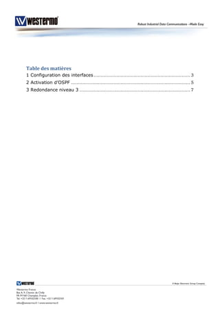 Ce document présente la configuration du protocole OSPF pour le routage dynamique entre deux routeurs interconnectés. Il aborde les étapes de préparation des interfaces, l'activation d'OSPF en déclarant les réseaux à diffuser, et l'utilisation d'OSPF pour gérer la redondance des chemins avec une sélection basée sur le coût. Enfin, il explique comment attribuer des priorités aux liens pour optimiser le routage.