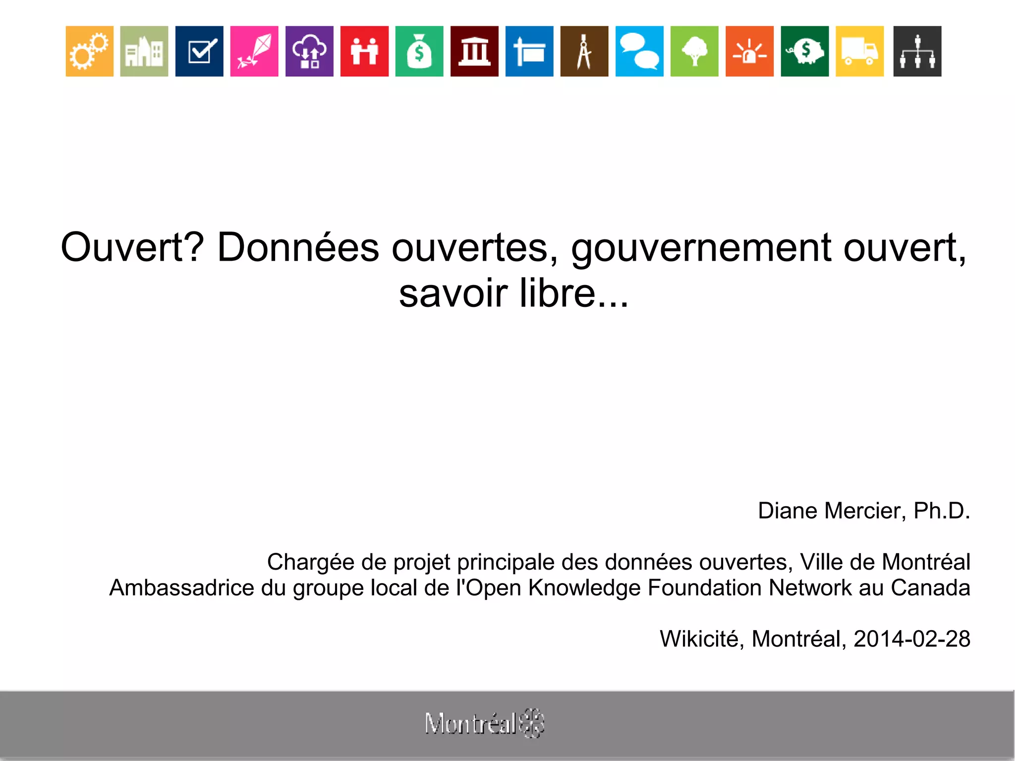 Le document aborde les concepts de savoir libre et de gouvernement ouvert, soulignant l'importance de la transparence, de la participation citoyenne et de la collaboration. Le savoir libre est défini comme des données et contenus accessibles et réutilisables, tandis que le gouvernement ouvert vise à améliorer l'efficacité et la responsabilité des administrations publiques. Une stratégie de données ouvertes est présentée comme essentielle pour faciliter le transfert de savoir entre citoyens et administrations.