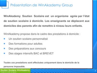Winakademy est un organisme agréé proposant du soutien scolaire personnalisé, des formations pour adultes, des préparations aux concours, et des stages intensifs à domicile. L'entreprise se distingue par un recrutement rigoureux de ses enseignants et propose ses services dans toute la France ainsi qu'à l'international. Winakademy s'engage à offrir une qualité d'enseignement élevée avec différentes options d'apprentissage, y compris des cours individuels et des ateliers de découverte de métiers.