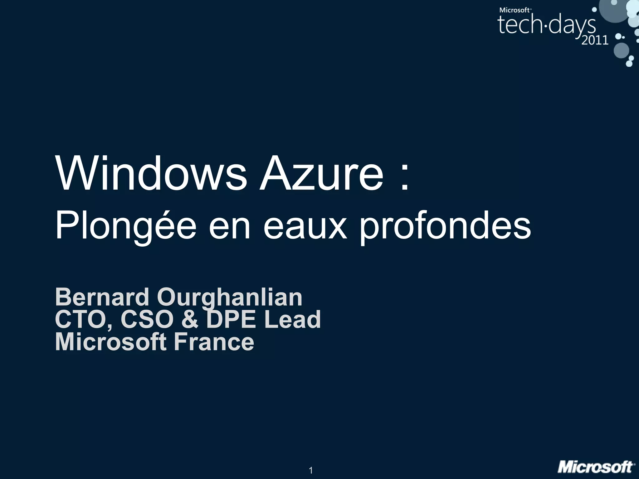 Le document présente un aperçu de Microsoft Windows Azure, mettant en avant les fondamentaux du cloud computing, les types de services (IaaS, PaaS, SaaS) et les fonctionnalités clés de la plateforme. Il décrit la gestion des ressources via le Fabric Controller, les processus de déploiement et de mise à jour des services, ainsi que les mécanismes garantissant la disponibilité et la sécurité. Enfin, il aborde l'architecture générale et les exigences pour le fonctionnement efficace d'Azure.