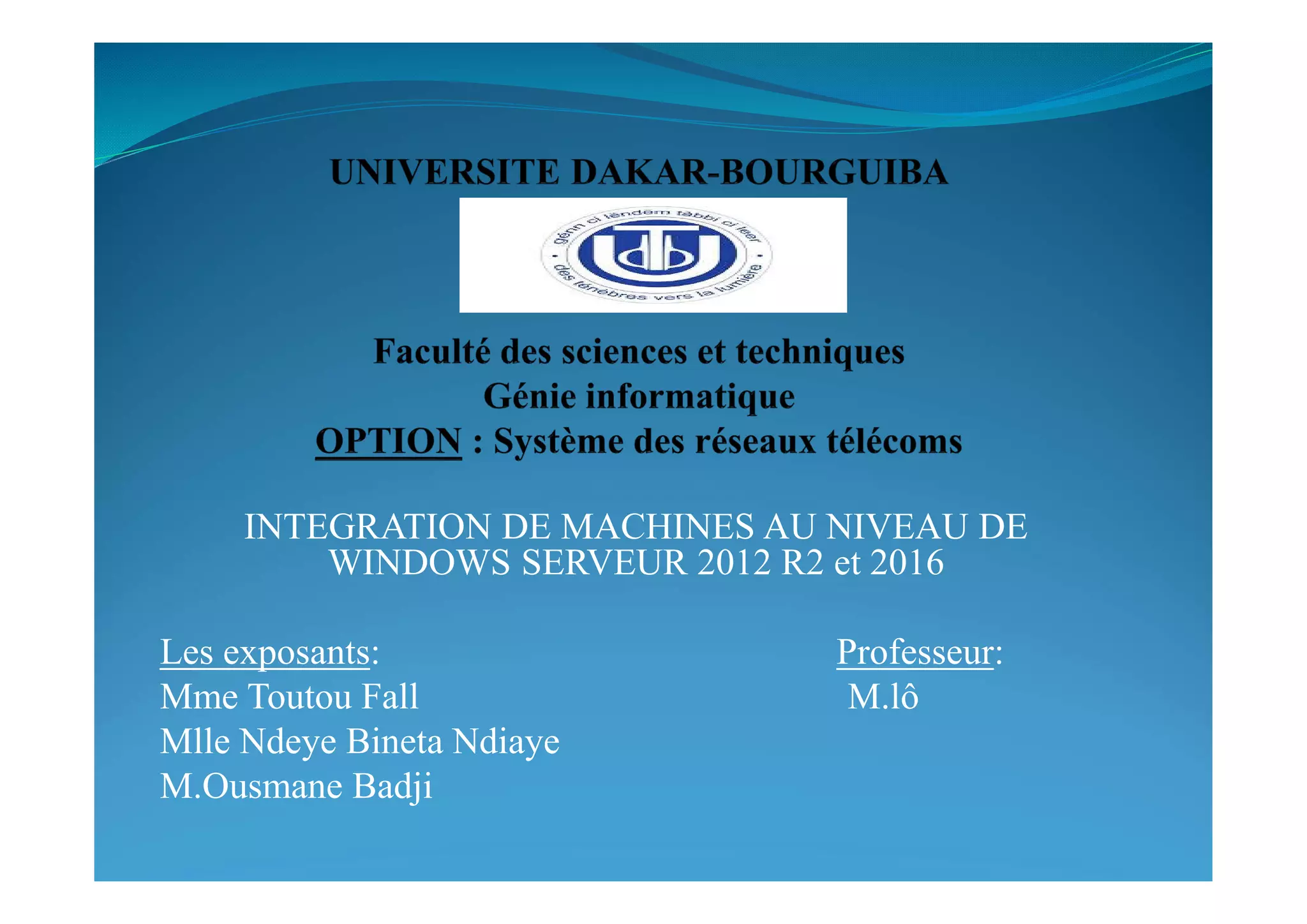 Le document traite de l'intégration de machines dans les environnements Windows Server 2012 R2 et 2016, en présentant leurs caractéristiques, la configuration d'Active Directory, ainsi que l'installation et l'intégration des machines clientes. Un tableau comparatif met en avant les différences fonctionnelles clés entre les deux versions de Windows Server. La conclusion souligne l'importance de cette recherche pour consolider les connaissances en administration Windows et indique que l'intégration des machines clientes est similaire pour les deux versions.