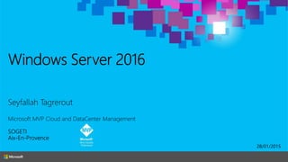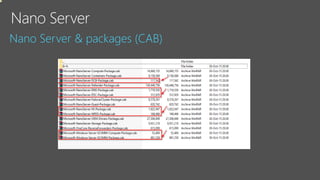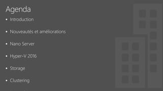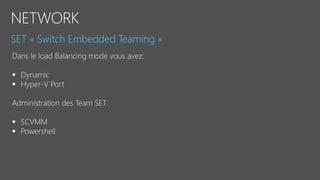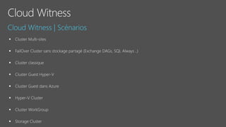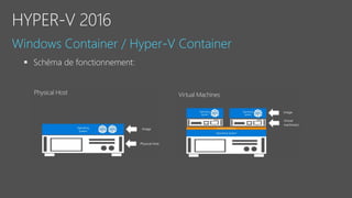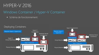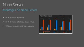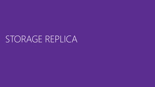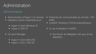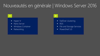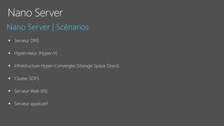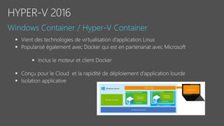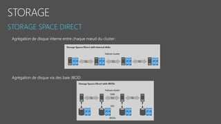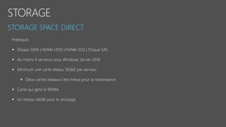 Le document fournit un aperçu détaillé des fonctionnalités et des configurations de Windows Server 2016, y compris l'utilisation de Nano Server, Hyper-V, et les conteneurs. Il décrit également les options de réplication de stockage synchrones et asynchrones ainsi que les exigences de mise en place de clusters de basculement. Des spécifications techniques et des commandes PowerShell pour la gestion et l'administration des services sont également mentionnées.
