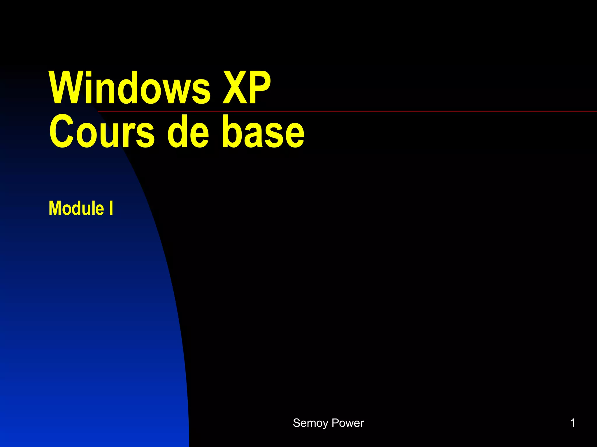 Le document présente un cours de base sur Windows XP, expliquant son fonctionnement et ses principales fonctionnalités. Il couvre des sujets tels que la navigation sur le bureau, l'enregistrement de fichiers, l'utilisation du clic et du double clic, ainsi que le rôle des pilotes matériels et des logiciels. Enfin, il aborde les concepts fondamentaux de la mémoire informatique et des types de fichiers.