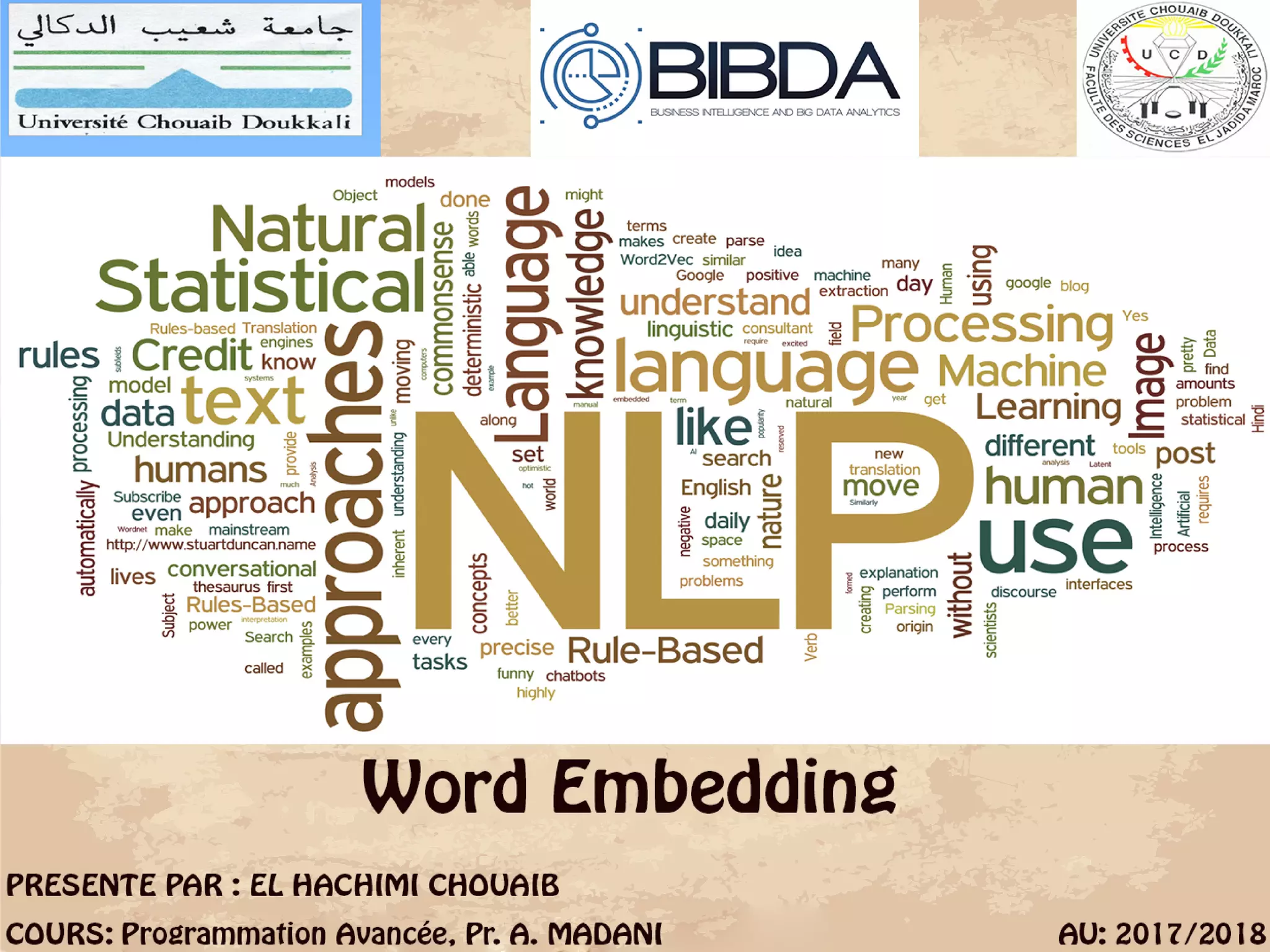 Le document traite des concepts fondamentaux du traitement du langage naturel (NLP), explorant des domaines tels que la compréhension du langage naturel (NLU) et la génération de langage naturel (NLG). Il retrace l'histoire du NLP depuis les premiers traducteurs automatiques jusqu'à l'essor des algorithmes d'apprentissage automatique, tout en abordant des techniques comme le modèle d'espace vectoriel et le TF-IDF pour la pondération des termes. Il souligne également les défis liés à l'ambiguïté linguistique et présente des méthodes modernes comme le word embedding et la bibliothèque Python Gensim pour l'extraction sémantique.