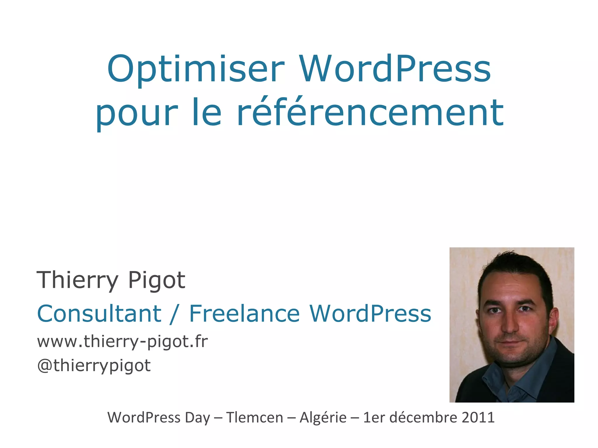 Le document propose des conseils pour optimiser un site WordPress pour le référencement, en se concentrant sur les éléments essentiels du SEO 'on-page' et 'off-page'. Il aborde des sujets tels que l'utilisation des balises meta, l'optimisation des images, et la gestion des pings, tout en recommandant des plugins pour améliorer la visibilité et la vitesse du site. L'auteur, Thierry Pigot, partage également des bonnes pratiques pour éviter le contenu dupliqué et améliorer l'indexation des contenus.
