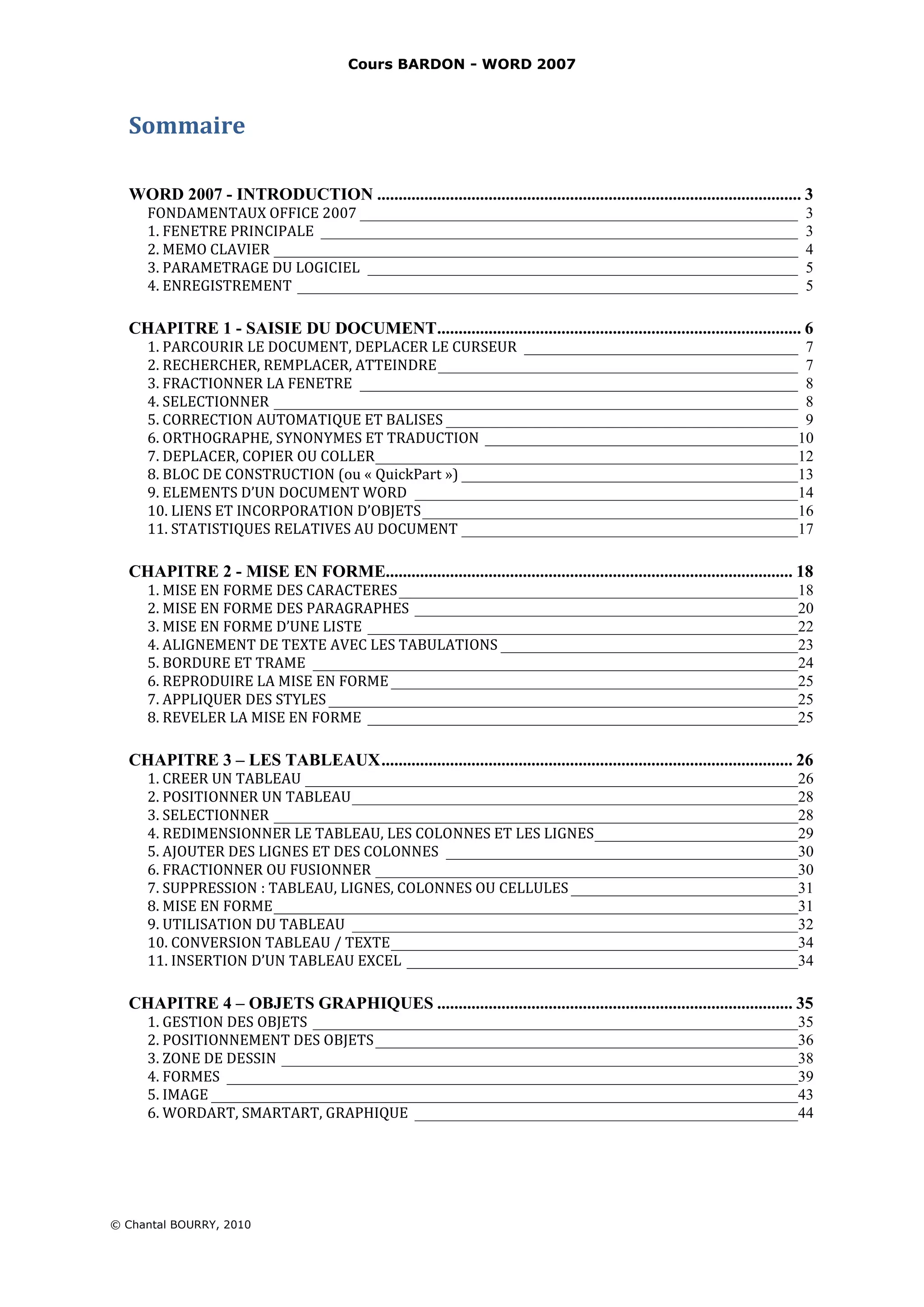Le document présente un guide complet sur l'utilisation de Word 2007, abordant divers aspects tels que la saisie et la mise en forme de documents, l'insertion de tableaux et d'objets graphiques, ainsi que la mise en page et les styles. Il contient aussi des conseils sur le paramétrage du logiciel, l'enregistrement des fichiers, et des techniques avancées pour gérer des longs documents. Le guide inclut également une section sur le publipostage et la gestion des références.