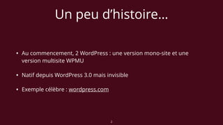 Le document présente une synthèse sur WordPress et le multisite, abordant son histoire, ses fonctionnalités clés et ses inconvénients. Il décrit les conditions nécessaires pour déployer un réseau de sites et donne des exemples d'utilisation efficace. Enfin, il indique des pré-requis techniques pour créer un réseau de sites multisite avec WordPress.