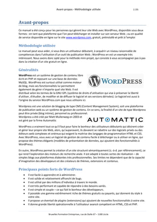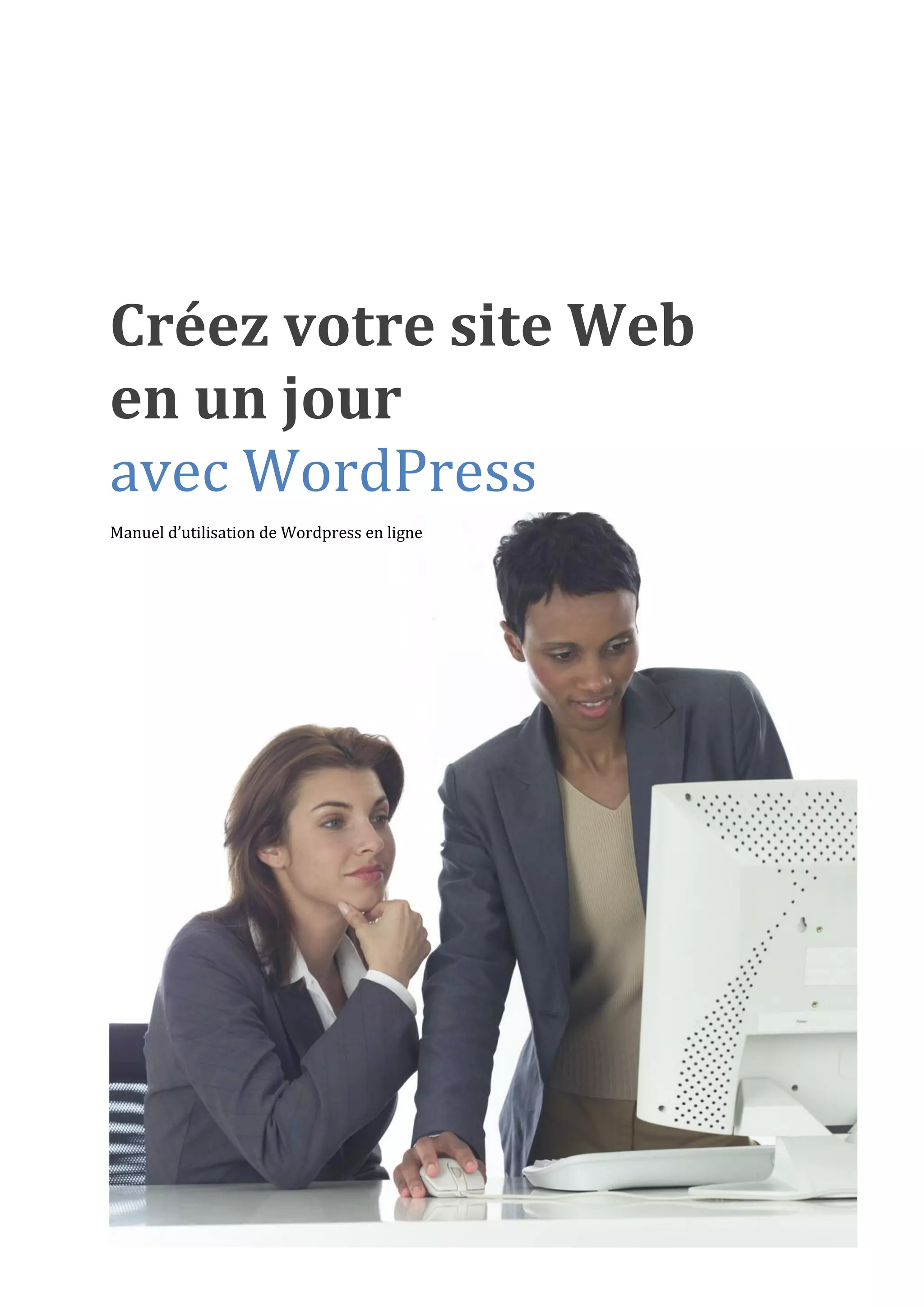 Ce manuel d'utilisation de WordPress guide les utilisateurs débutants à créer et gérer un site web en un jour, en détaillant les fonctionnalités et les étapes nécessaires à l'inscription et à la structuration du contenu. WordPress est présenté comme un système de gestion de contenu flexible et accessible, permettant de créer des blogs ou des sites professionnels aisément. Le document aborde également la différence entre pages et articles, ainsi que l'organisation des contenus à l'aide de catégories et de plugins.