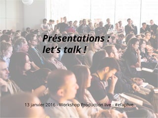 Le document présente un atelier sur la production live, abordant des thématiques comme la création de contenu en temps réel et l'importance de la diffusion numérique dans la communication. Il souligne que tout le monde, y compris les marques et les particuliers, peut devenir producteur de contenu grâce à des outils accessibles. Les participants sont encouragés à expérimenter avec différents formats et à réfléchir sur leur stratégie de narration et d'audience.