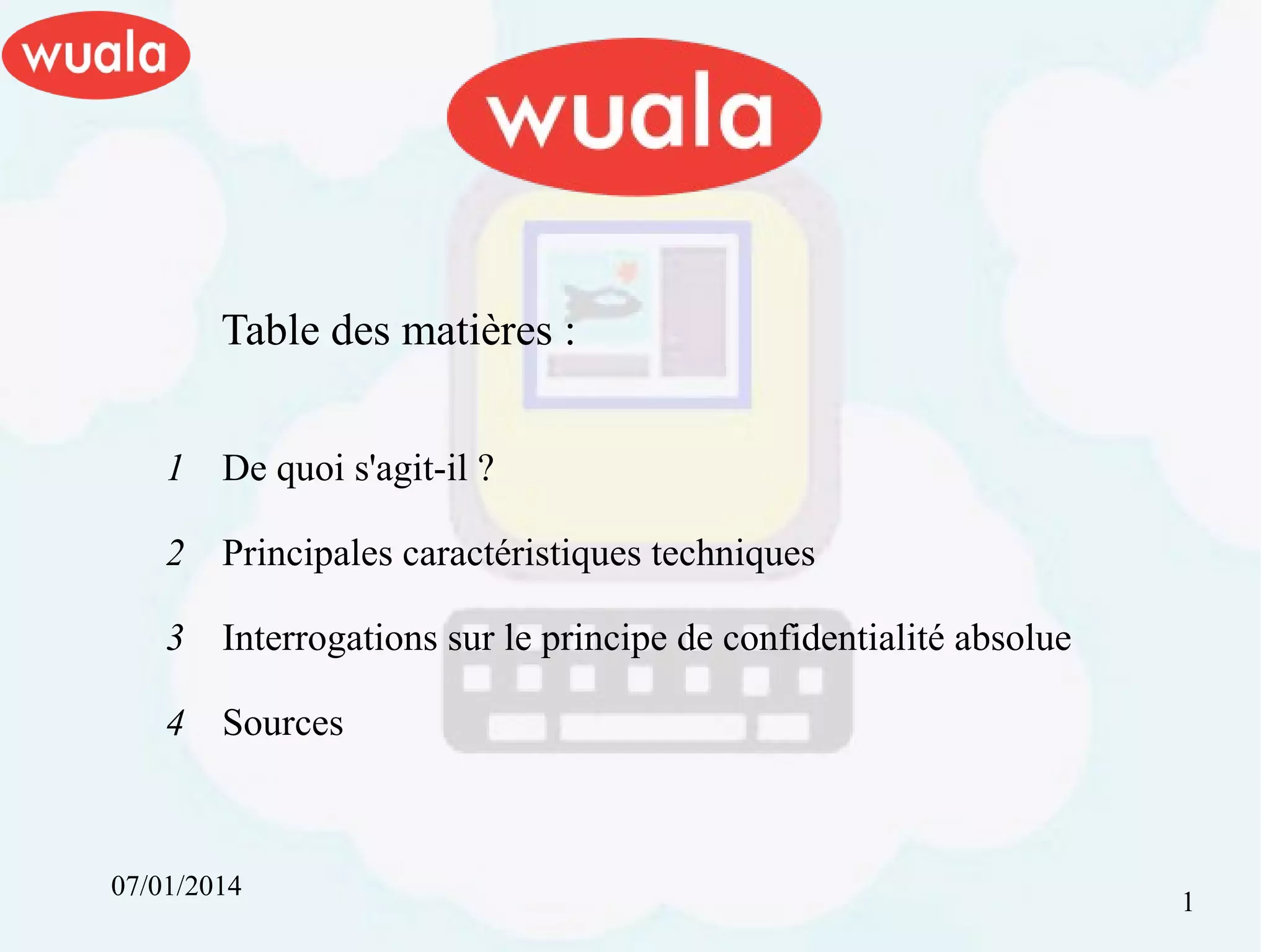 Wuala est une société suisse de stockage sécurisé en ligne permettant la consultation, l'ajout et la modification de fichiers, ainsi que leur partage. Les fichiers sont systématiquement encryptés lors de l'upload, empêchant même l'entreprise d'y accéder, mais il y a des restrictions sur le type de fichiers acceptés. La société se réserve le droit de transmettre des données à des tiers si elle estime que cela est nécessaire.