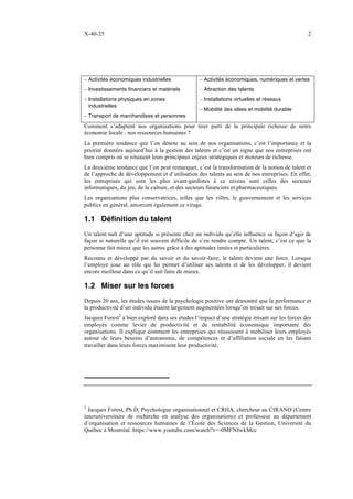Le document traite de la création d'une culture de performance au sein des entreprises à Montréal en mettant l'accent sur l'importance des talents des employés dans le contexte économique actuel. Il souligne que les organisations doivent adapter leur approche en misant sur les forces des employés pour maximiser la productivité et créer un avantage concurrentiel dans un monde en évolution rapide. Enfin, il propose des méthodes pour transformer les processus de gestion des ressources humaines afin de mieux répondre aux défis contemporains liés au recrutement et à l'engagement des talents.