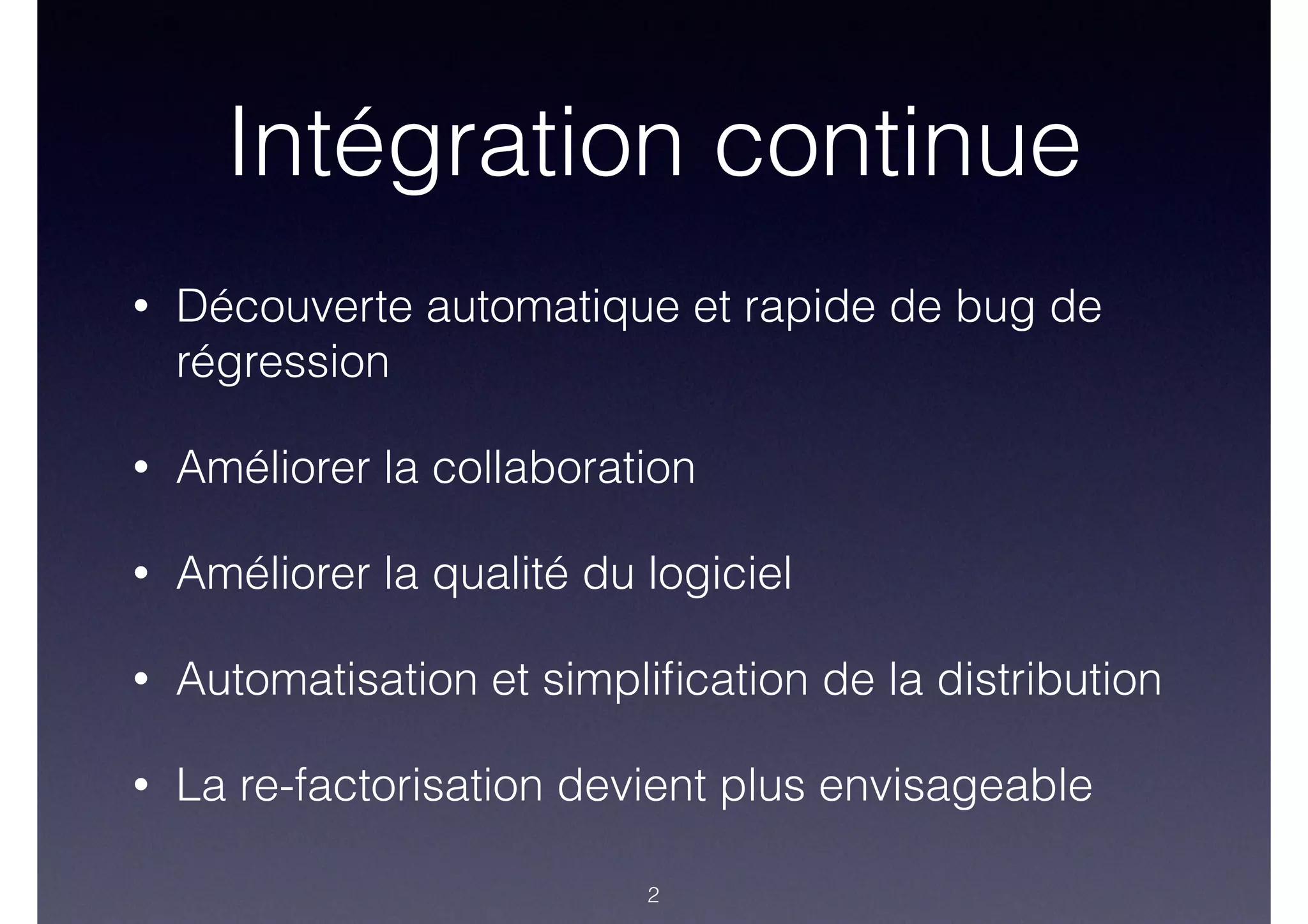Le document traite de l'intégration continue avec Xcode Server, abordant ses avantages tels que la découverte rapide des bugs et l'amélioration de la qualité du logiciel. Il présente également les types de tests recommandés, les pré-requis et les fonctions de Xcode Server, ainsi que des expériences pratiques et solutions aux problèmes rencontrés. Enfin, il mentionne l'utilisation de l'API REST de Xcode Server et des contacts pour des questions supplémentaires.