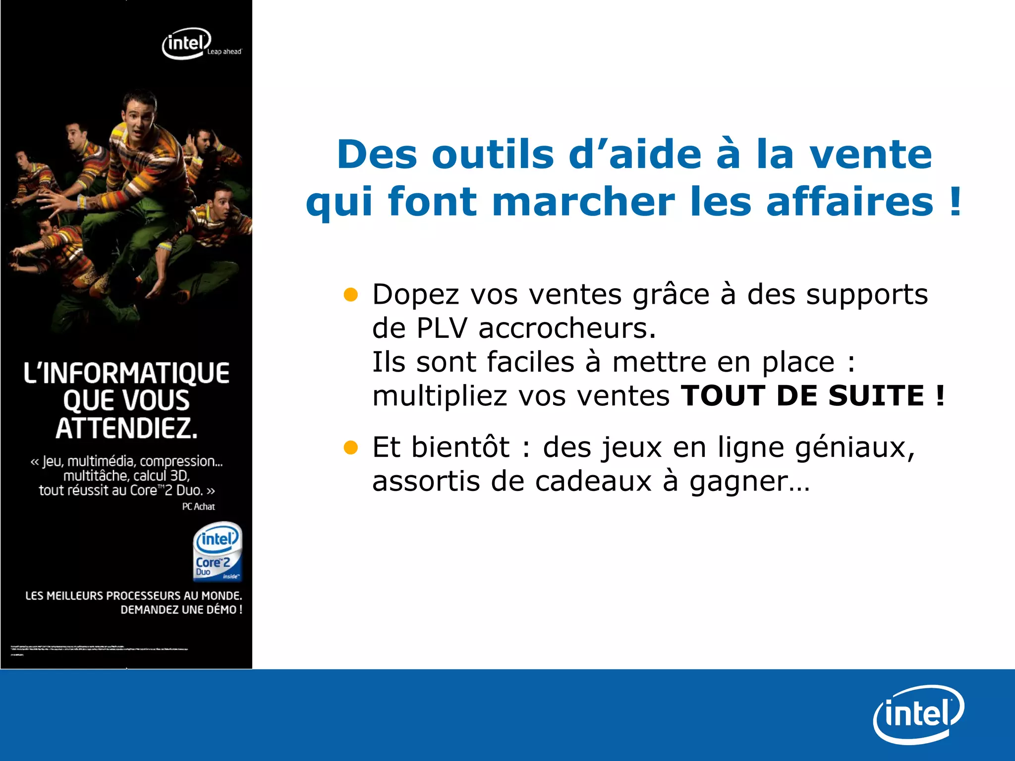 Le document présente divers outils de soutien à la vente, notamment des supports de PLV pour stimuler les ventes des processeurs Intel® Core™ 2 Duo. Ces outils comprennent des dépliants, des affichages et des autocollants, visant à accroître la visibilité et à communiquer des messages clairs aux clients. Il souligne également l'importance de la vente croisée et propose des éléments pour maximiser l'espace de promotion en magasin.