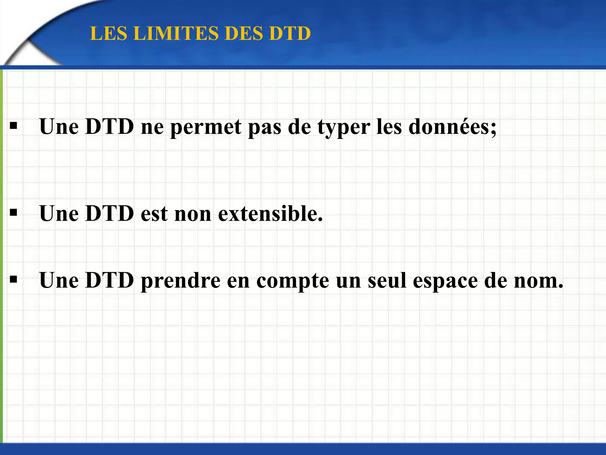 Ce document traite des limitations des DTD et présente XML Schema comme une alternative avancée pour définir la structure et les types de données des documents XML. Il décrit la structure de XML Schema, ses types de données et ses éléments complexes, ainsi que les restrictions possibles sur les données. En fin de compte, XML Schema permet de gérer des données de manière plus flexible et extensible que les DTD.