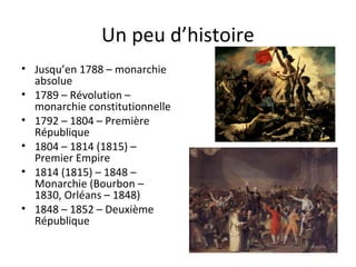 Le document retrace l'évolution du système politique en France depuis la monarchie absolue jusqu'à la Cinquième République, en passant par plusieurs républiques et empires. Il décrit la structure du gouvernement actuel, le rôle du président, du premier ministre et du parlement, ainsi que les récents résultats électoraux. Enfin, il mentionne quelques figures politiques clés et des événements marquants de l'histoire politique française.