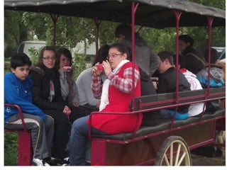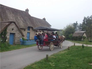Le document décrit une excursion en calèche dans la Brière le 12 avril 2011, où les participants étaient divisés en deux groupes. Ils ont exploré les marais en chaland et pris des photos mémorables, incluant des moments avec des amis. L'ambiance est joviale et marquée par des échanges en français et en espagnol.