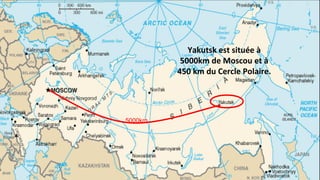 Yakutsk, située à 5000 km de Moscou et à 450 km du cercle polaire, est considérée comme la ville la plus froide du monde avec des températures pouvant descendre jusqu'à -64,4 °C. En hiver, le fleuve Léna gèle complètement, devenant une autoroute pour les véhicules, tandis que les habitants s'adaptent à des conditions extrêmes avec des vêtements spécialement conçus. Malgré le climat rigoureux, 270 000 personnes vivent à Yakutsk, où la vie quotidienne est marquée par une résilience face à des températures pouvant atteindre -55 °C.
