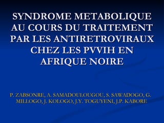 Le document examine la prévalence et les facteurs de risque du syndrome métabolique chez les personnes vivant avec le VIH sous traitement antirétroviral en Afrique noire. Il met en évidence une association significative entre la durée du traitement par inhibiteurs de la protéase et l'augmentation des troubles métaboliques, ainsi que leur impact sur le risque cardiovasculaire. L'étude souligne la nécessité de stratégies de prévention spécifiques pour réduire les complications cardiovasculaires liées à ces traitements.