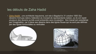 Zaha Hadid, architecte iraquienne née à Bagdad en 1950, est reconnue pour son approche imaginative de l'architecture, ayant réalisé 950 projets dans 44 pays, dont des œuvres emblématiques tels que le Vitra Fire Station et le Dongdaemun Design Plaza. Elle a été honorée par de nombreux prix prestigieux, dont le prix Pritzker en 2004, et est reconnue comme l'une des figures les plus influentes du monde de l'architecture. Hadid est décédée en 2016 à l'âge de 65 ans après une crise cardiaque.