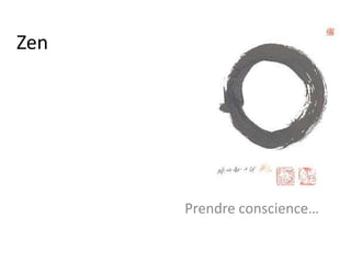 Le document explore le concept du zen comme un moyen de prendre conscience de soi, de ses émotions et de ses relations avec les autres et le monde. Il aborde diverses pratiques telles que la méditation, la cohérence cardiaque et l'écoute des sens pour vivre dans l'instant présent. L'accent est mis sur la gestion des émotions, l'importance de l'eau et de l'alimentation, et sur le fait que la compréhension et l'amour vont de pair.