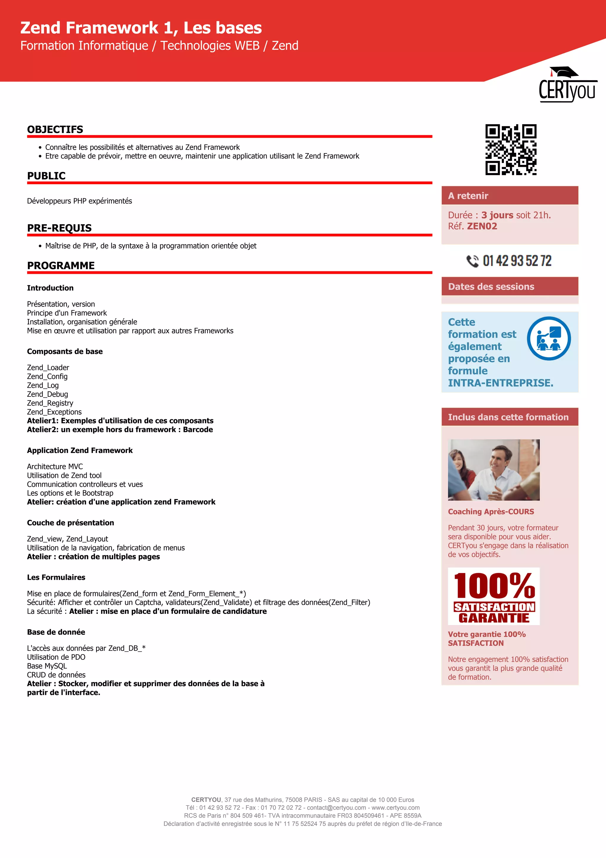 Certyou propose une formation sur le Zend Framework pour les développeurs PHP expérimentés, d'une durée de 3 jours incluant des ateliers pratiques. Les participants apprendront à utiliser les composants fondamentaux, à créer des applications et à gérer la sécurité et les bases de données. Un coaching après-cours est également inclus pour assurer un suivi et une réussite complète des objectifs de formation.