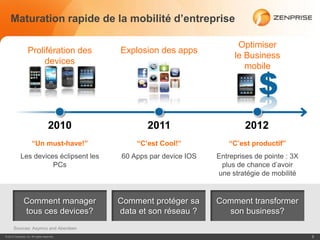 Zenprise met en avant l'importance croissante de la mobilité dans les entreprises, soulignant les défis de gestion et de sécurité associés à la prolifération des appareils mobiles et des applications. Le document aborde les tendances, les cas d'usage et les solutions nécessaires pour intégrer la mobilité au sein de la stratégie d'entreprise. Enfin, Zenprise se positionne comme un leader en fournissant des solutions complètes de gestion et de sécurité pour les appareils mobiles.