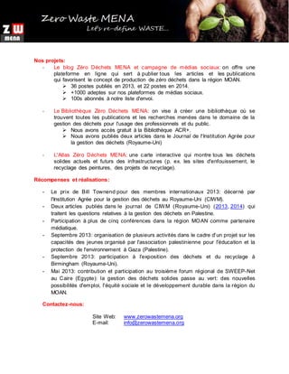 'Zéro déchets mena' est une initiative régionale visant à promouvoir la gestion durable des déchets dans le Moyen-Orient et l'Afrique du Nord, en mettant l'accent sur la prévention, la réutilisation et le recyclage. L'organisation collabore avec des gouvernements, des entreprises et des ONG pour éduquer le public, faciliter la recherche et créer des programmes sociaux à travers divers projets et partenariats. Parmi ses réalisations, elle a obtenu des récompenses et écrit des articles sur la gestion des déchets, tout en développant des ressources en ligne et des outils interactifs pour sensibiliser et informer.