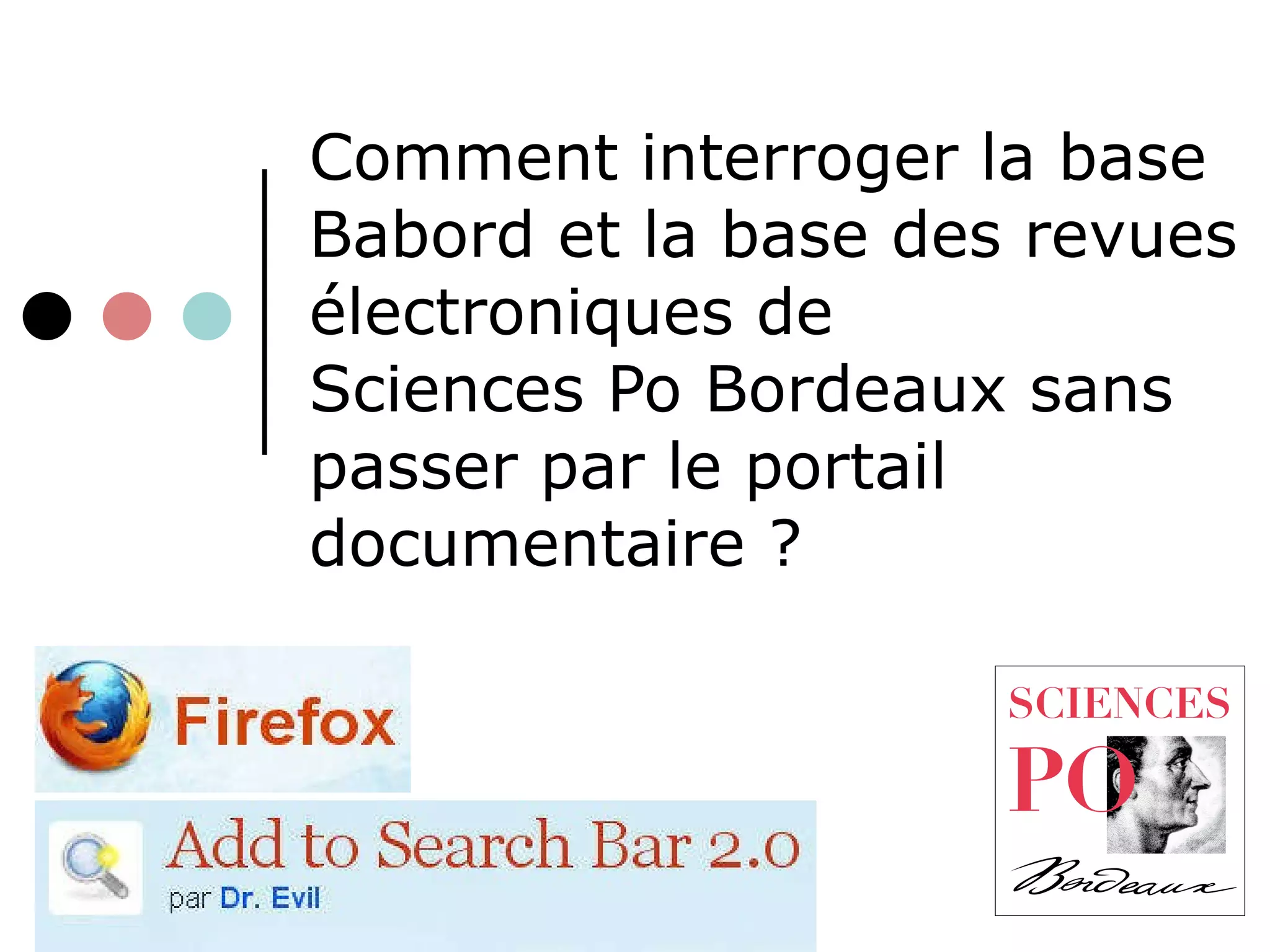 Ce document explique comment interroger les bases Babord et les revues électroniques de Sciences Po Bordeaux sans utiliser le portail documentaire, en utilisant le navigateur Firefox. Il décrit deux étapes principales : télécharger un plug-in pour ajouter des moteurs de recherche à la barre de recherche de Firefox, puis configurer ces moteurs pour permettre des requêtes directes. Cette méthode fonctionne également avec d'autres bases de données reconnues par Mozilla.