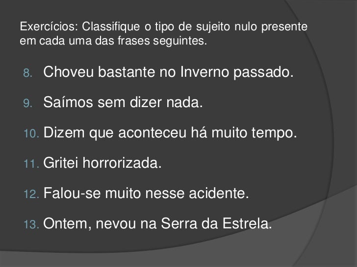 9. 9. Exercícios: Classifique o tipo de sujeito nulo presenteem cada uma das frases seguintes.8. Choveu bastante no Inverno passado.9. Saímos sem dizer nada.10. Dizem que aconteceu há muito tempo.11. Gritei horrorizada.12. Falou-se muito nesse acidente.13. Ontem, nevou na Serra da Estrela.