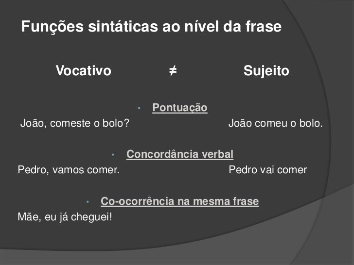 10. 10. Funções sintáticas ao nível da fraseVocativo Função sintáctica usada em contextos de interpelação, sendo frequente em frases interrogativas, exclamativas e imperativas. O vocativo está sempre isolado dos restantes elementos da frase através do uso de vírgulas. Ex.: João, estou muito desiludida contigo! 11