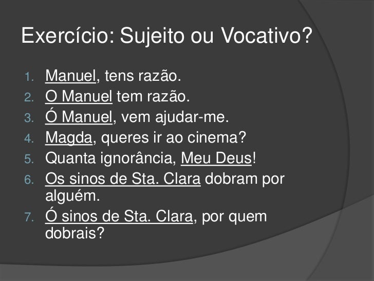 12. 12. Exercício: Sujeito ou Vocativo?1. Manuel, tens razão.2. O Manuel tem razão.3. Ó Manuel, vem ajudar-me.4. Magda, queres ir ao cinema?5. Quanta ignorância, Meu Deus!6. Os sinos de Sta. Clara dobram por alguém.7. Ó sinos de Sta. Clara, por quem dobrais?