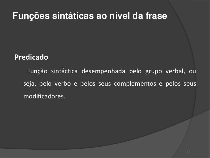 13. 13. Funções sintáticas ao nível da frasePredicado Função sintáctica desempenhada pelo grupo verbal, ou seja, pelo verbo e pelos seus complementos e pelos seus modificadores. 14