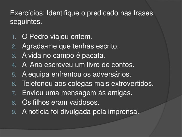 15. 15. Exercícios: Identifique o predicado nas frasesseguintes.1. O Pedro viajou ontem.2. Agrada-me que tenhas escrito.3. A vida no campo é pacata.4. A Ana escreveu um livro de contos.5. A equipa enfrentou os adversários.6. Telefonou aos colegas mais extrovertidos.7. Enviou uma mensagem às amigas.8. Os filhos eram vaidosos.9. A notícia foi divulgada pela imprensa.