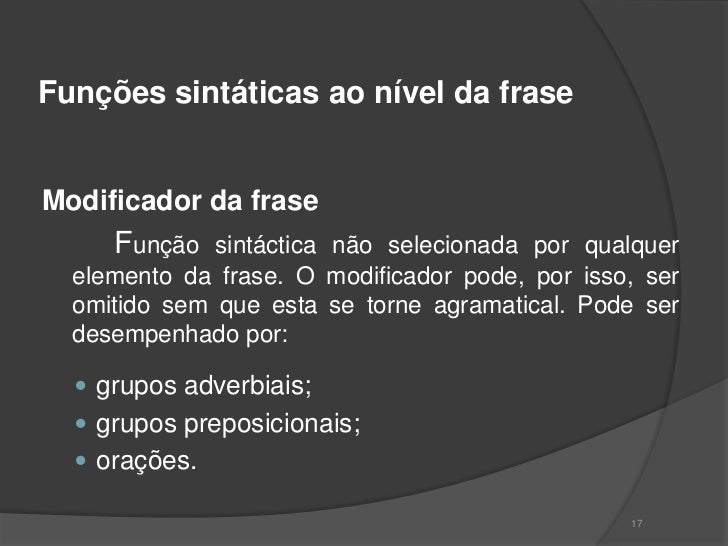 16. 16. Funções sintáticas ao nível da fraseModificador da frase Função sintáctica não selecionada por qualquer elemento da frase. O modificador pode, por isso, ser omitido sem que esta se torne agramatical. Pode ser desempenhado por:  grupos adverbiais;  grupos preposicionais;  orações. 17