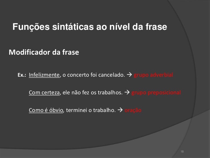 17. 17. Funções sintáticas ao nível da fraseModificador da frase Ex.: Infelizmente, o concerto foi cancelado.  grupo adverbial Com certeza, ele não fez os trabalhos.  grupo preposicional Como é óbvio, terminei o trabalho.  oração 18