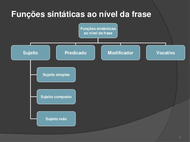 1. 1. Funções sintáticas ao nível da frase Funções sintácticas ao nível da frase Sujeito Predicado Modificador Vocativo Sujeito simples Sujeito composto Sujeito nulo 2