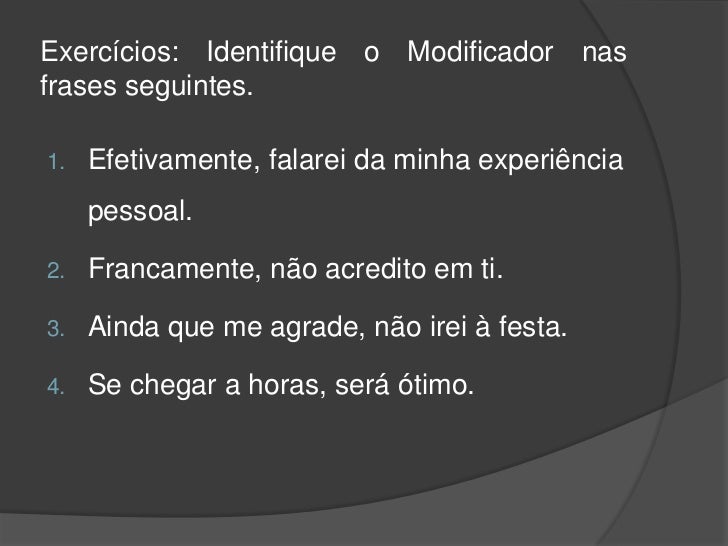 19. 19. Exercícios: Identifique o Modificador nasfrases seguintes.1. Efetivamente, falarei da minha experiência pessoal.2. Francamente, não acredito em ti.3. Ainda que me agrade, não irei à festa.4. Se chegar a horas, será ótimo.