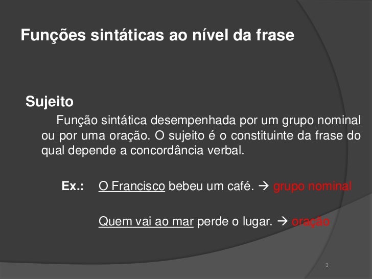 2. 2. Funções sintáticas ao nível da fraseSujeito Função sintática desempenhada por um grupo nominal ou por uma oração. O sujeito é o constituinte da frase do qual depende a concordância verbal. Ex.: O Francisco bebeu um café.  grupo nominal Quem vai ao mar perde o lugar.  oração 3
