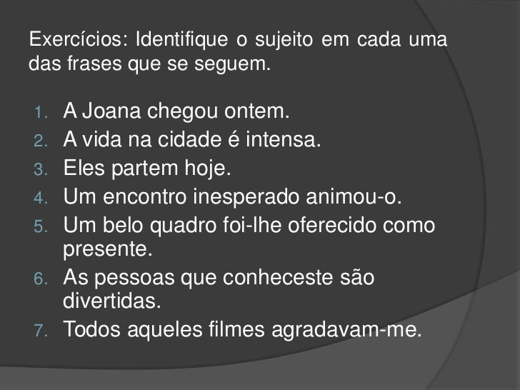 3. 3. Exercícios: Identifique o sujeito em cada umadas frases que se seguem.1. A Joana chegou ontem.2. A vida na cidade é intensa.3. Eles partem hoje.4. Um encontro inesperado animou-o.5. Um belo quadro foi-lhe oferecido como presente.6. As pessoas que conheceste são divertidas.7. Todos aqueles filmes agradavam-me.