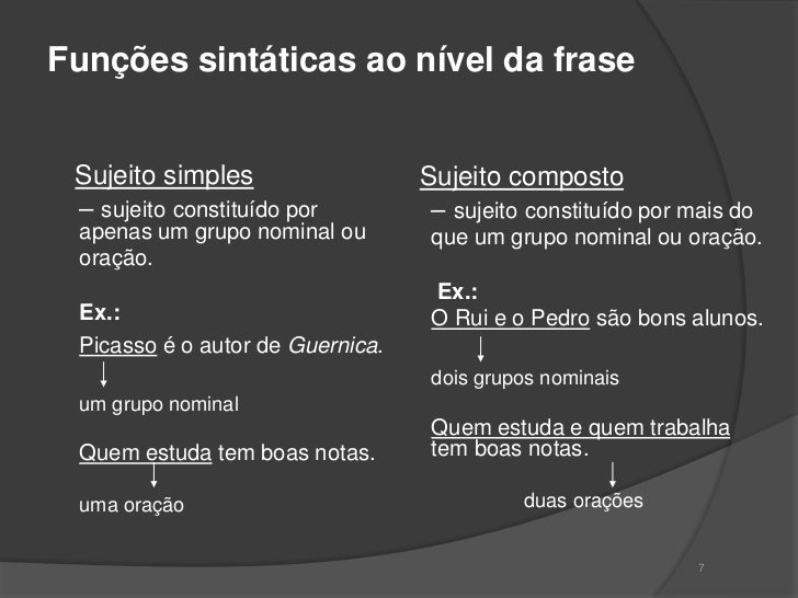 6. 6. Funções sintáticas ao nível da frase Sujeito simples Sujeito composto – sujeito constituído por – sujeito constituído por mais do apenas um grupo nominal ou que um grupo nominal ou oração. oração. Ex.: Ex.: O Rui e o Pedro são bons alunos. Picasso é o autor de Guernica. dois grupos nominais um grupo nominal Quem estuda e quem trabalha Quem estuda tem boas notas. tem boas notas. uma oração duas orações 7