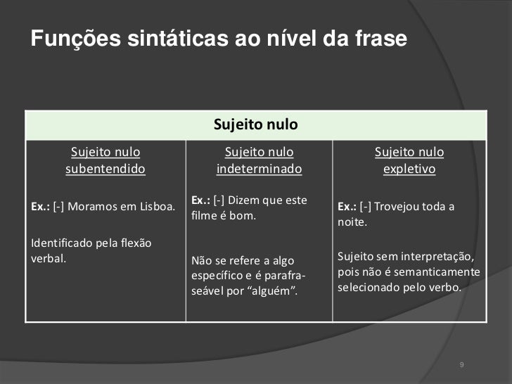 8. 8. Funções sintáticas ao nível da frase Sujeito nulo Sujeito nulo Sujeito nulo Sujeito nulo subentendido indeterminado expletivoEx.: [-] Moramos em Lisboa. Ex.: [-] Dizem que este Ex.: [-] Trovejou toda a filme é bom. noite.Identificado pela flexãoverbal. Não se refere a algo Sujeito sem interpretação, específico e é parafra- pois não é semanticamente seável por “alguém”. selecionado pelo verbo. 9
